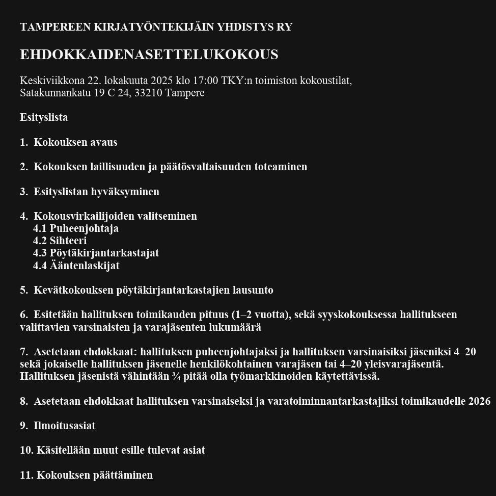 Tampereen Kirjatyöntekijäin Yhdistys on liittynyt Suomen Ammattiliittojen Solidaarisuuskeskus SASK, kannatusjäseneksi 2023